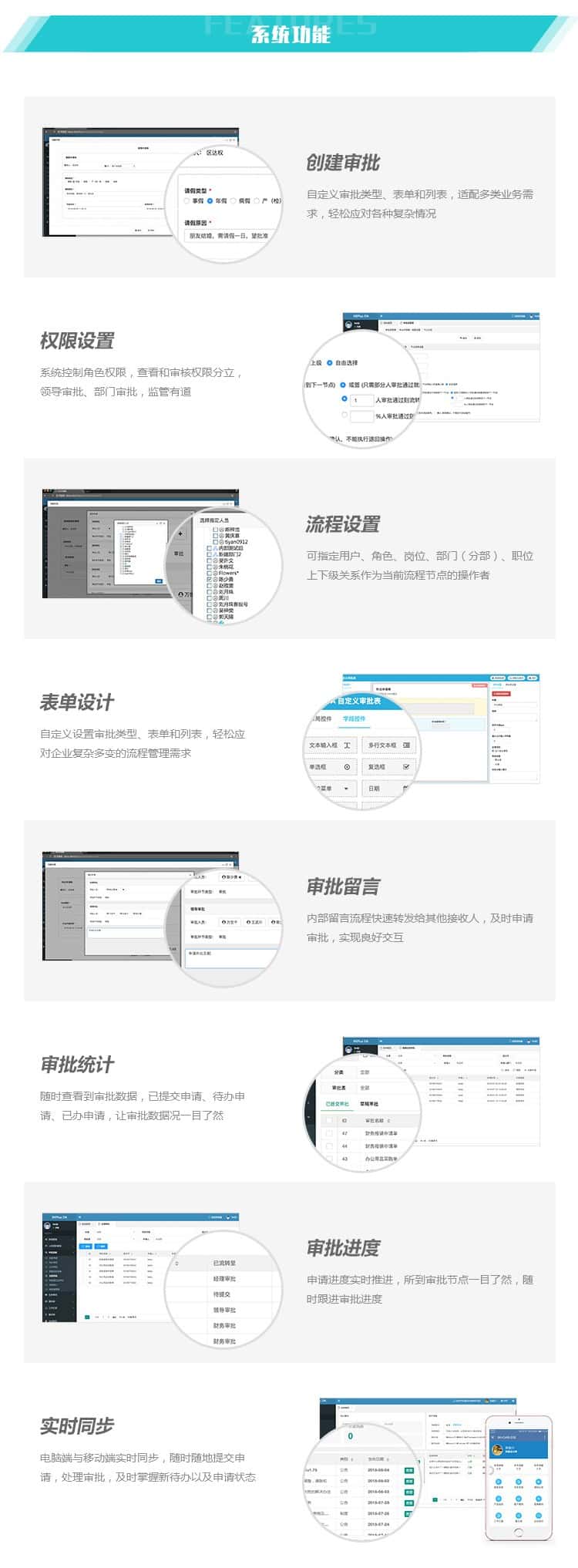 该系统自定义设置审批类型、表单和列表,轻松应对企业复杂多变的流程管理需求;科学严谨的审批流程、灵活可控的角色权限、清晰明了的数据记录,一键导出方便查看,只要带着手机,就能随时申请、实时审批。